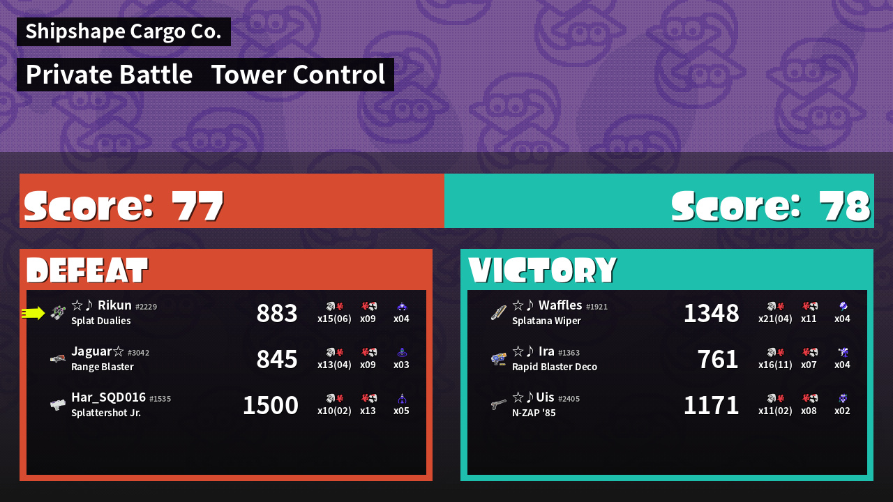 Kills / Deaths | 9 + 6 / 9 = Kill Ratio: 1.00 | ||