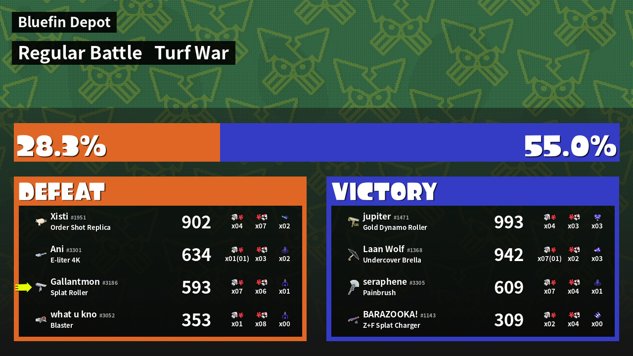 | Medals | #1 Overall Splatter #1 Enemy-Base Inker #1 Enemy Splatter | ||