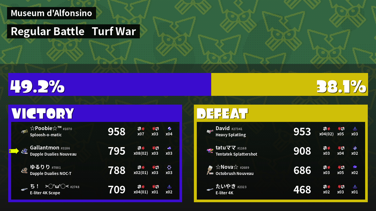 | Medals | #1 Overall Splatter #1 Popular Target #1 Enemy-Base Inker | ||