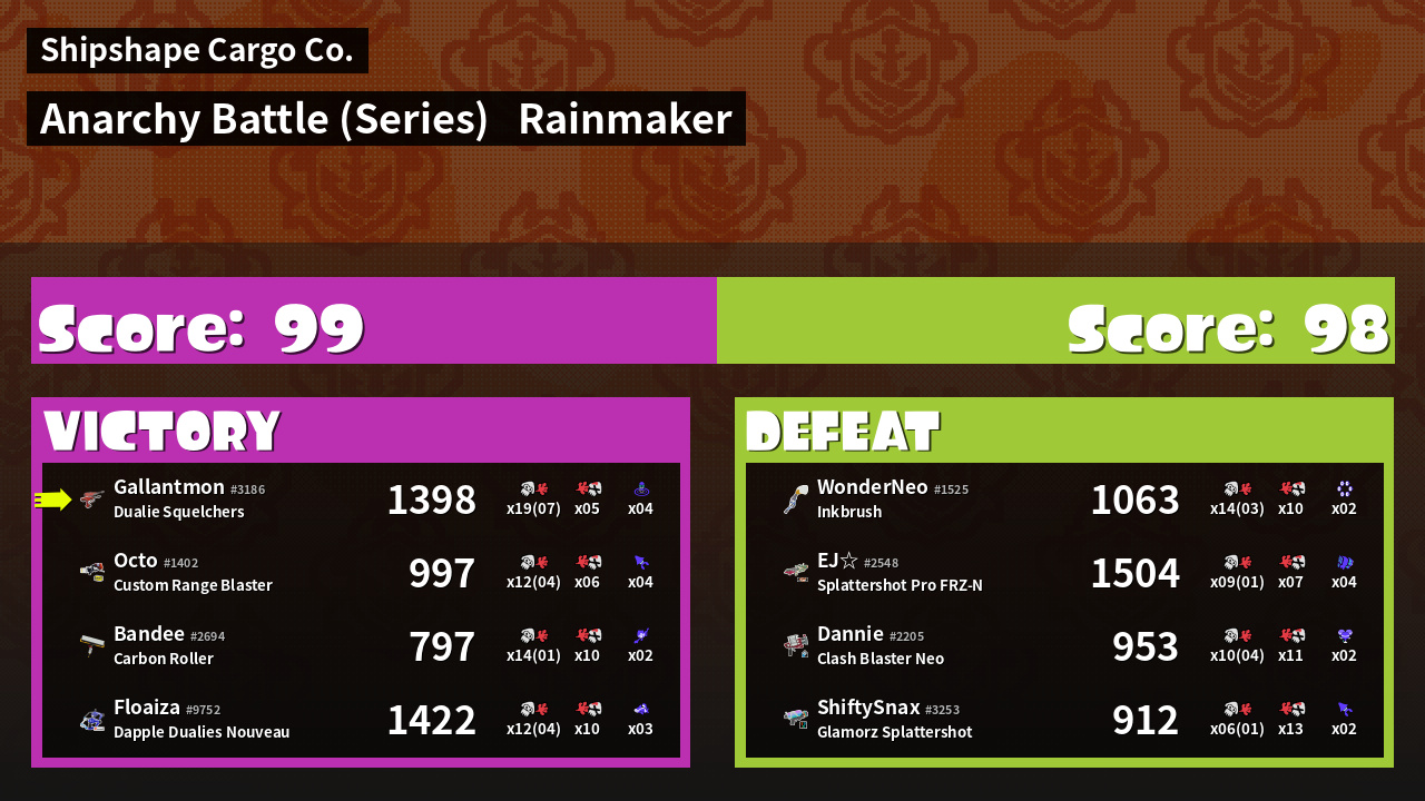 | Medals | #1 Overall Splatter #1 Popular Target #1 Super Jump Spot | ||