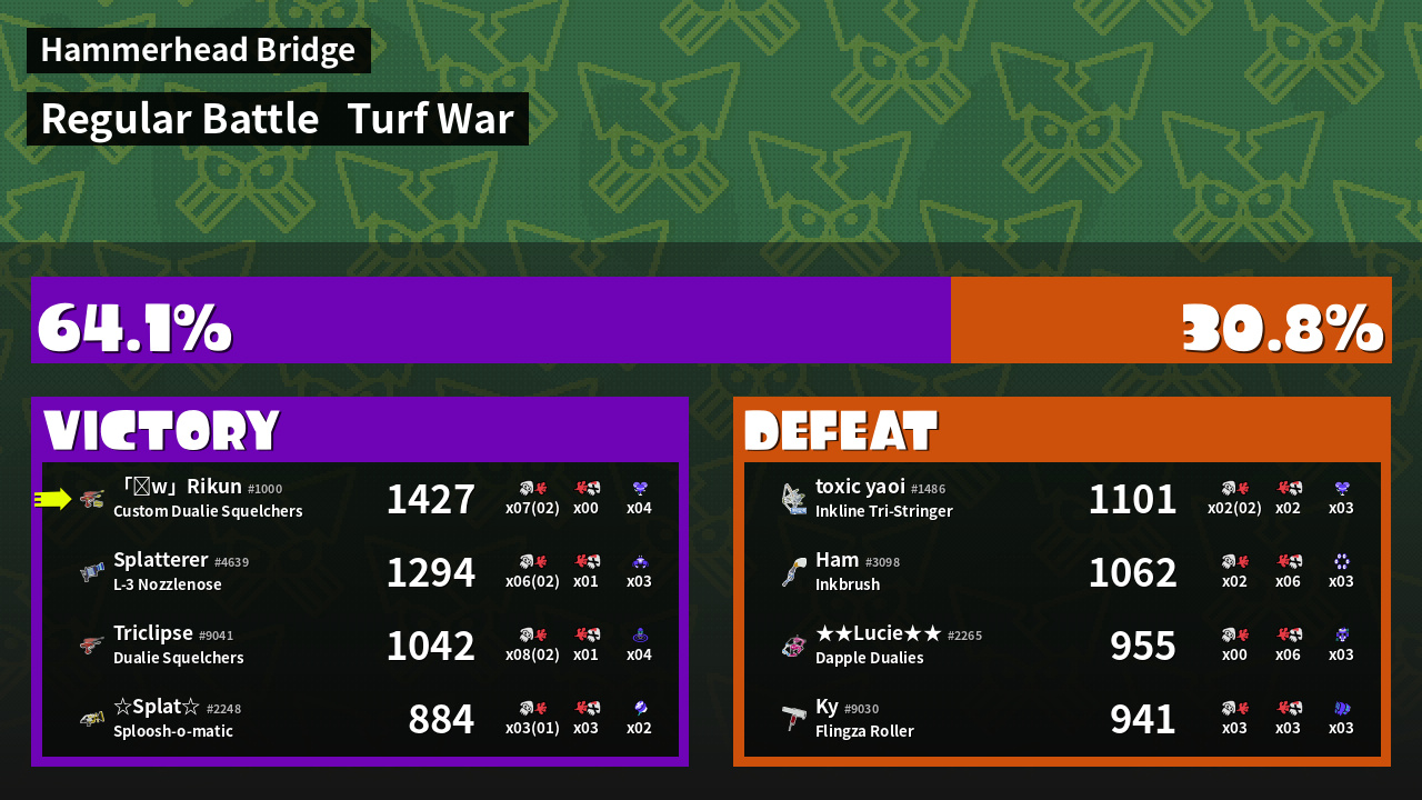 | Medals | #1 Turf Inker #1 Enemy-Base Inker #1 Splat Assister | ||
