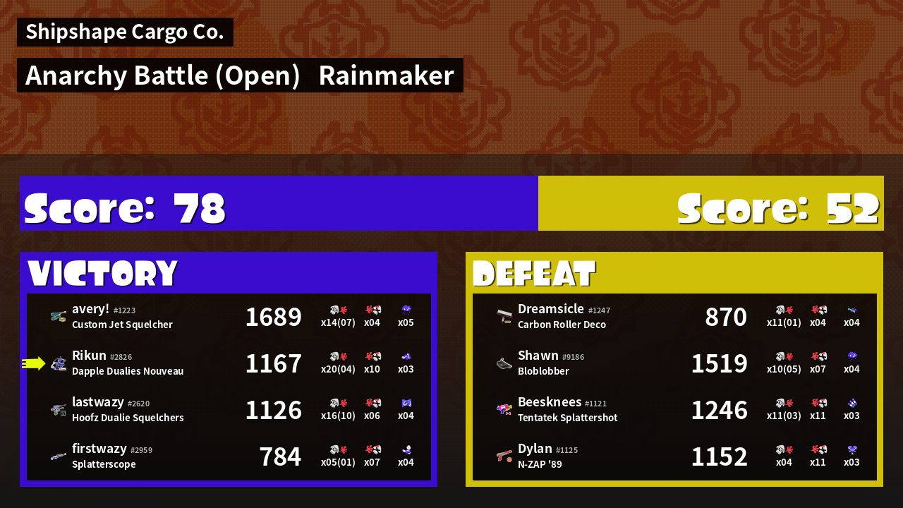 | Medals | #1 Overall Splatter #1 Enemy Splatter #1 Rainmaker Stopper | ||