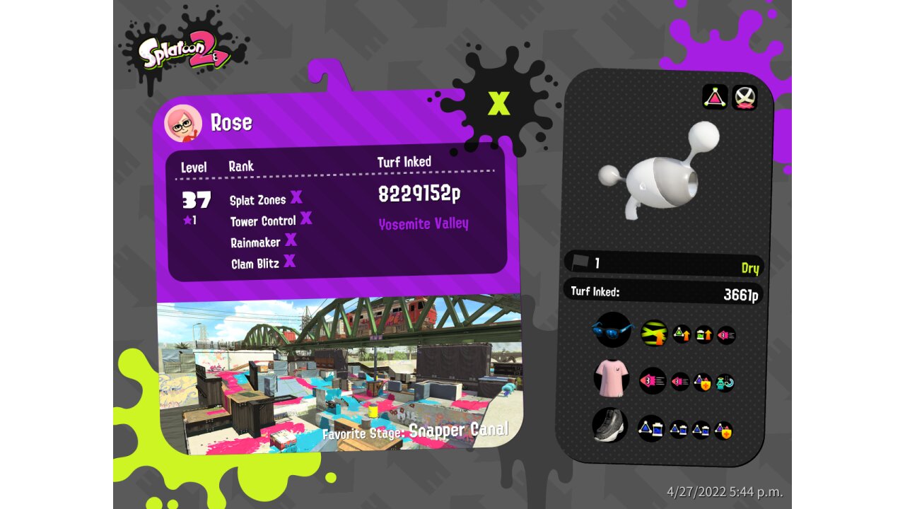| Name | Weapon | Level | Rank | Inked | k+a/sp | k/d |