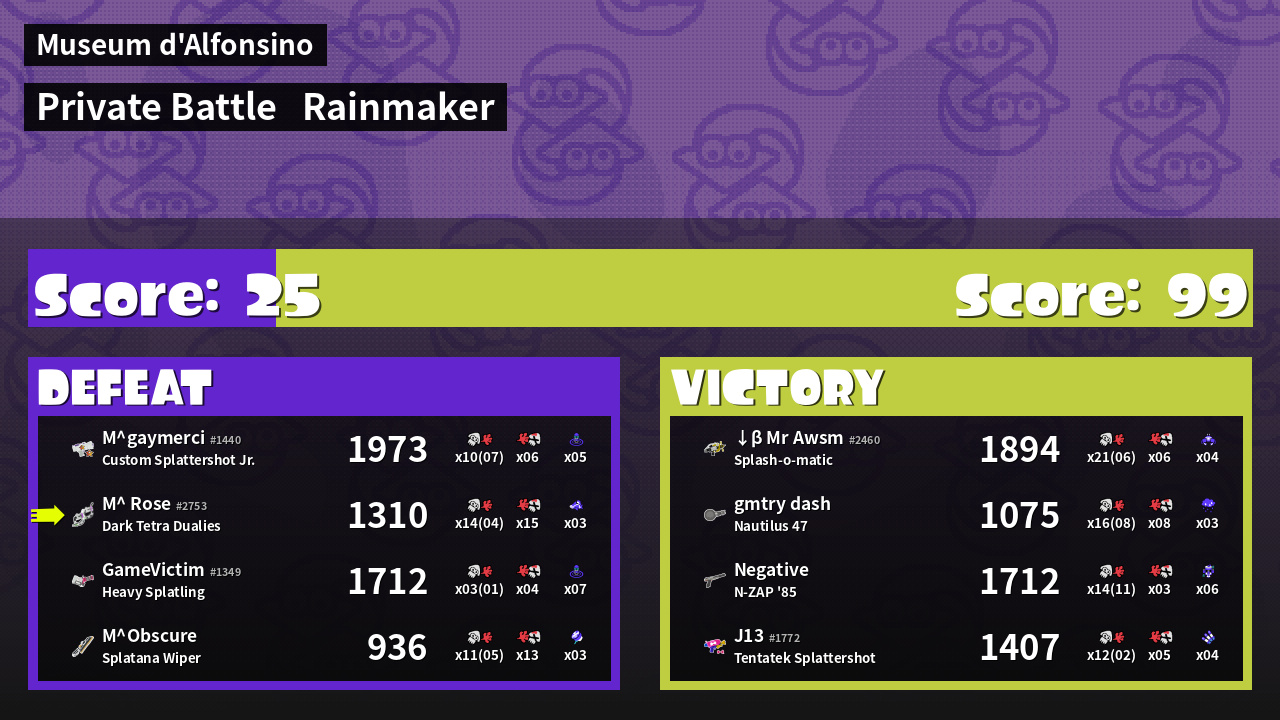 | Medals | #1 Overall Splatter #1 Enemy Splatter First Splat! | ||