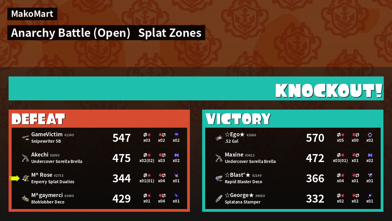 | Mode | Splat Zones - Anarchy Battle (Open) | ||