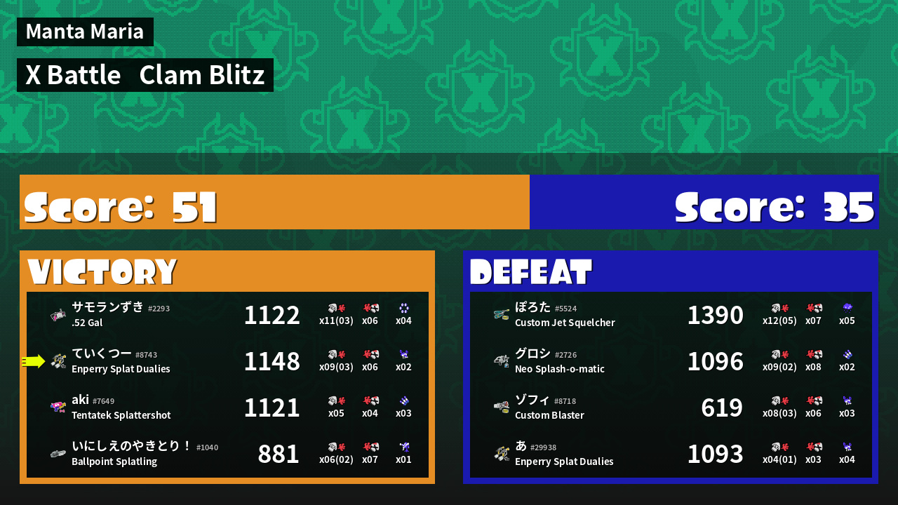 | Weapon | Enperry Splat Dualies ( Curling Bomb / Triple Splashdown) | ||