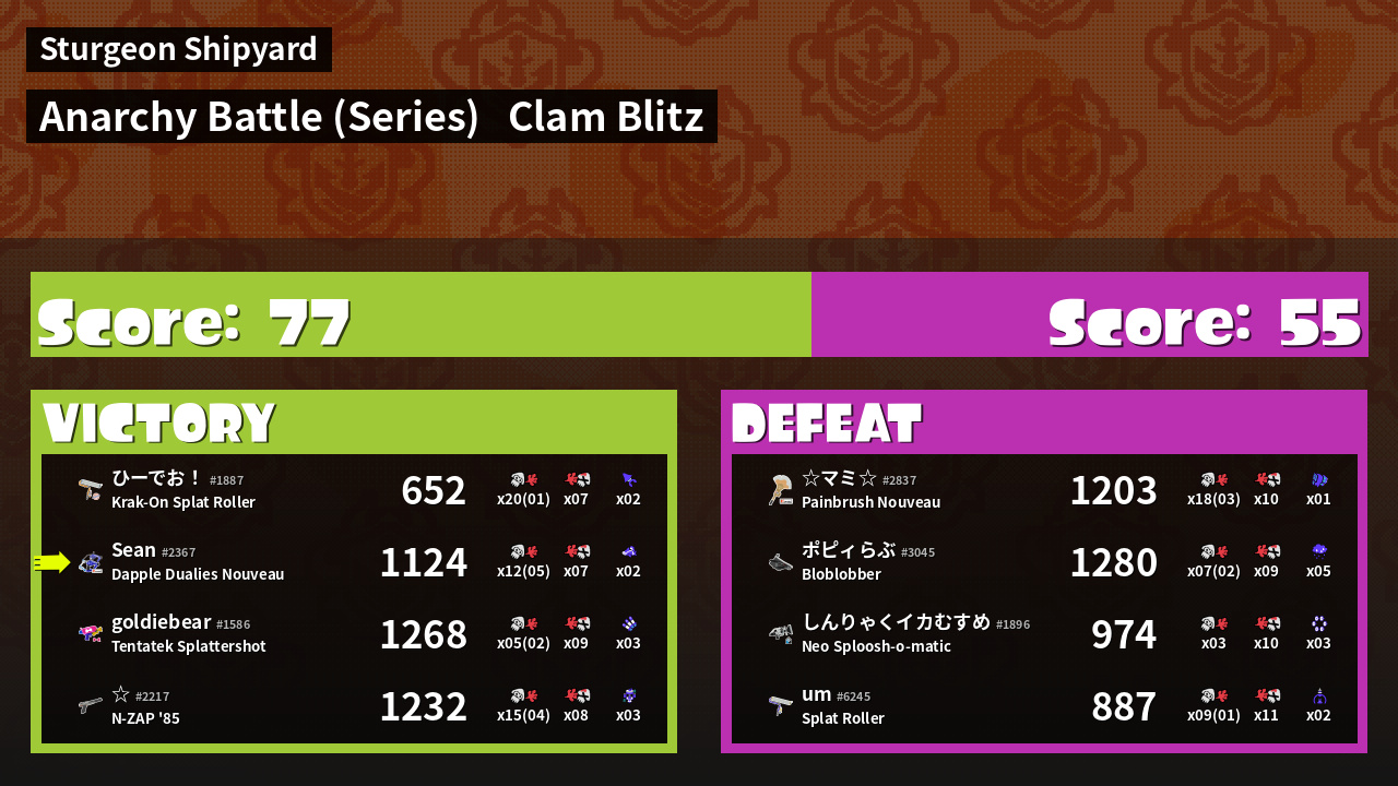 | Medals | #1 Score Booster #1 Clam Carrier #1 Splat Assister | ||