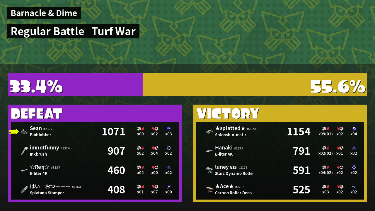 | Medals | #1 Turf Inker #1 Enemy-Base Inker #1 Ink Consumer | ||