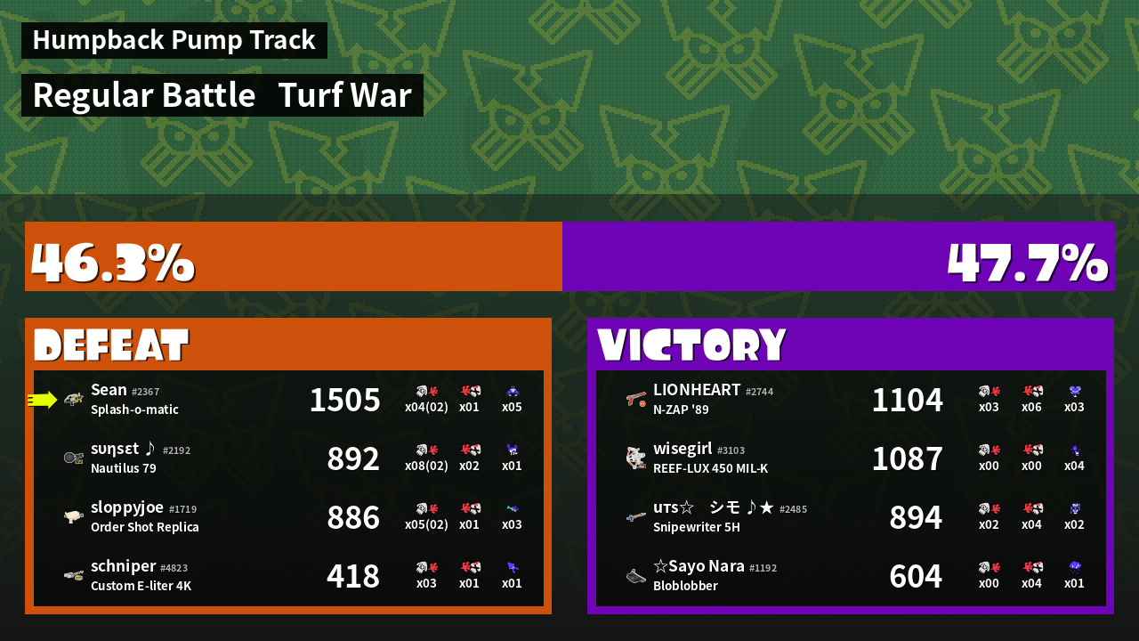 | Medals | #1 Turf Inker #1 Enemy-Base Inker #1 Splat Assister | ||