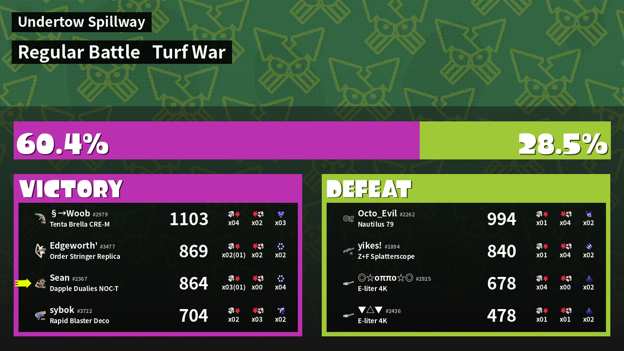 | Weapon | Dapple Dualies NOC-T ( Splat Bomb / Killer Wail 5.1) | ||
