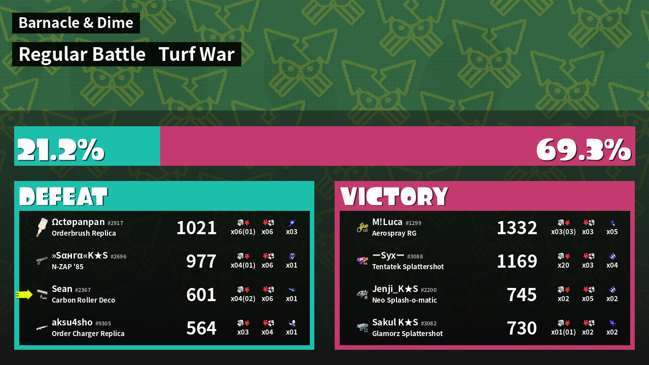 | Medals | #1 Enemy-Base Inker #1 Splat Assister #1 Damage Taker | ||