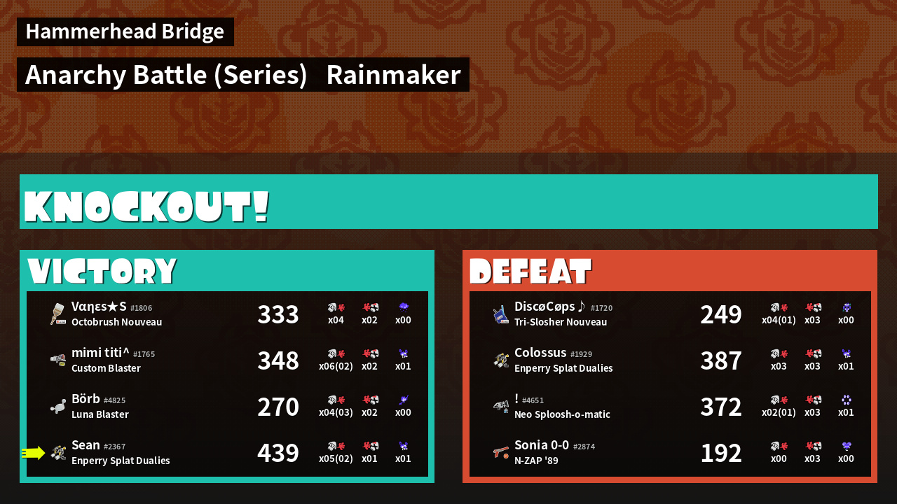 | Weapon | Enperry Splat Dualies ( Curling Bomb / Triple Splashdown) | ||