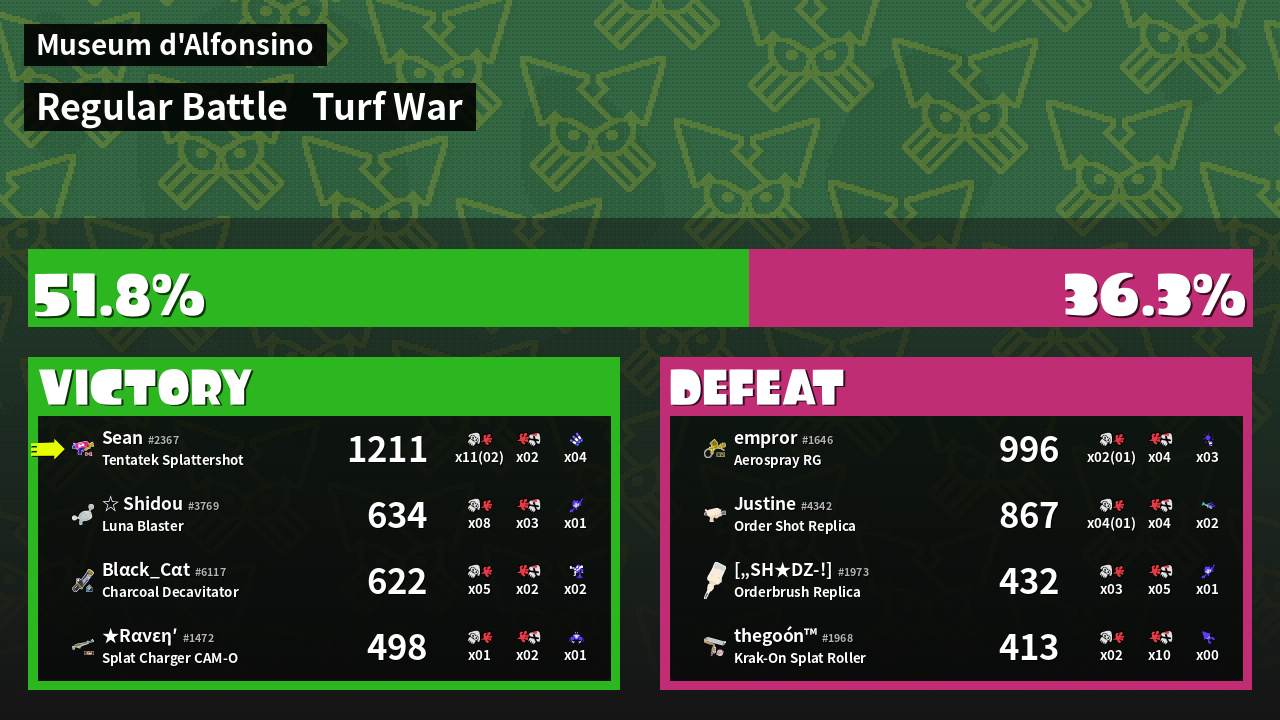 | Medals | #1 Overall Splatter #1 Turf Inker #1 Enemy-Base Inker | ||
