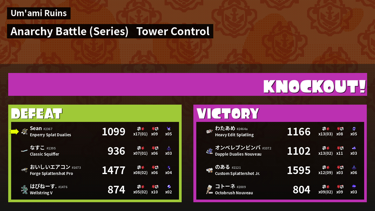 | Weapon | Enperry Splat Dualies ( Curling Bomb / Triple Splashdown) | ||