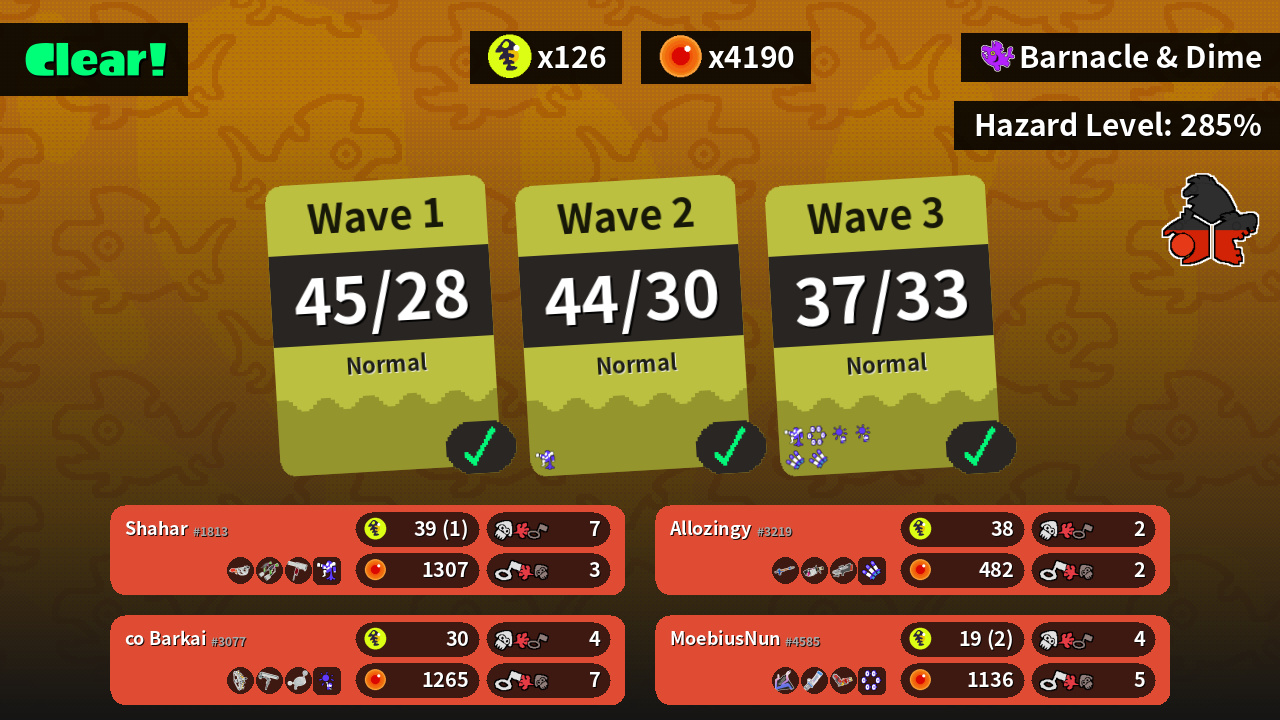 | Weapons | Goo Tuber Splat Dualies Flingza Roller | Snipewriter 5H .96 Gal S-BLAST '92 | Grizzco Stringer Dynamo Roller Luna Blaster | Slosher Mint Decavitator Hydra Splatling |