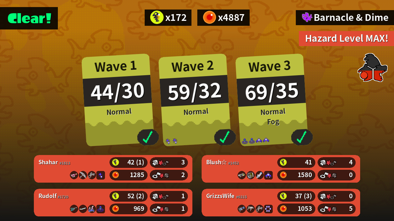 | Weapons | Rapid Blaster Pro Splat Brella Aerospray MG | Jet Squelcher Classic Squiffer Slosher | Splattershot Nova Grizzco Slosher Mint Decavitator | L-3 Nozzlenose Grizzco Roller Aerospray MG |