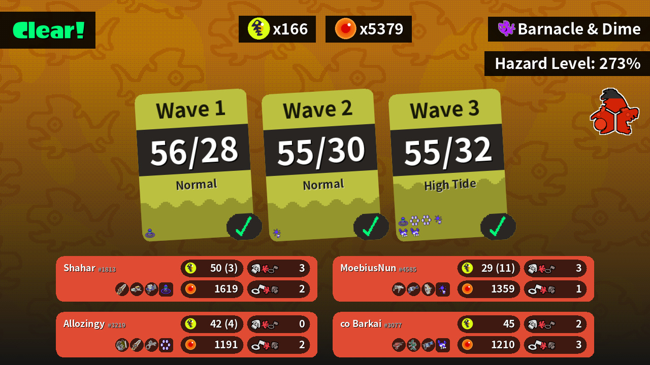| Weapons | Grizzco Splatana Grizzco Blaster Clash Blaster | Dualie Squelchers Wellstring V L-3 Nozzlenose | Grizzco Slosher Grizzco Splatana Aerospray MG | Grizzco Roller H-3 Nozzlenose Grizzco Stringer |