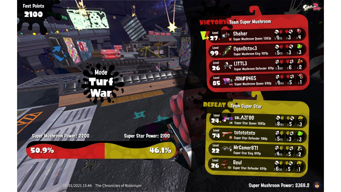 | Splatfest Title | Super Mushroom Queen → Super Mushroom Queen | |||||||||||||||||||||||||||||||