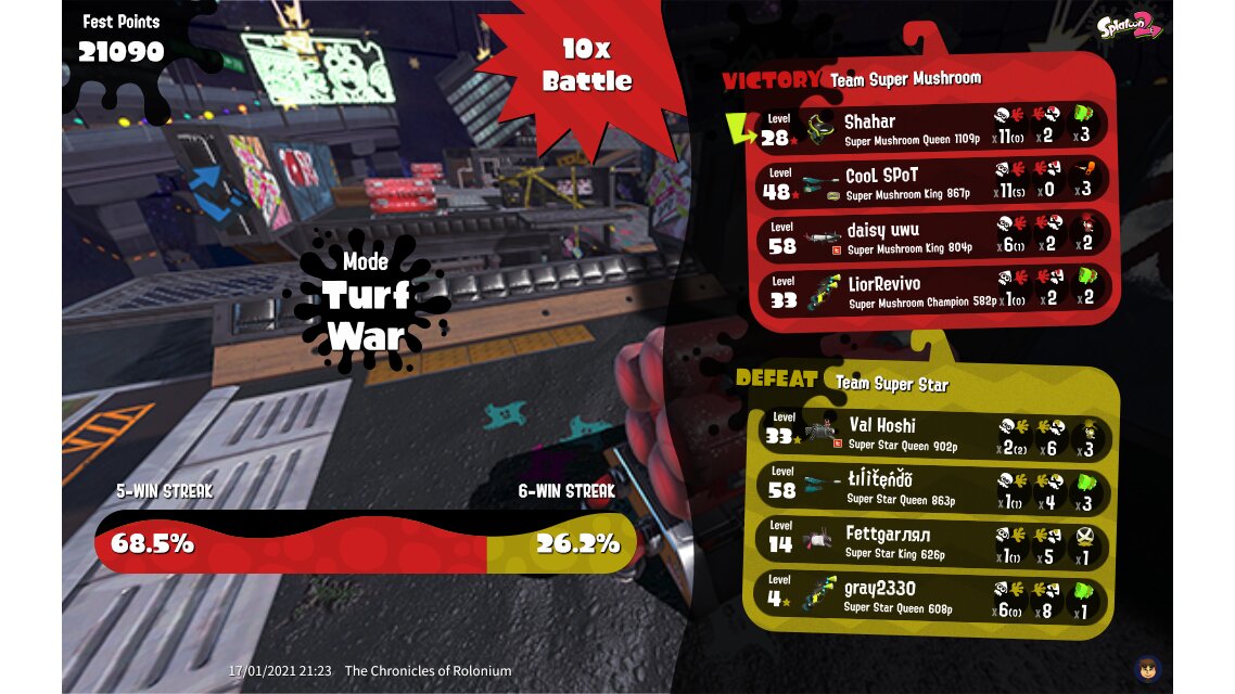 | Splatfest Title | Super Mushroom Queen → Super Mushroom Queen | ||||||||||||||||||||||||||||||||||