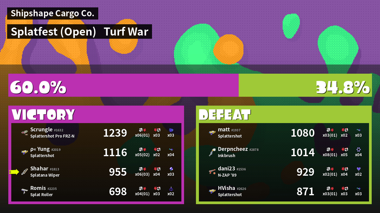 | Medals | #1 Overall Splatter #1 Popular Target #1 Home-Base Inker |