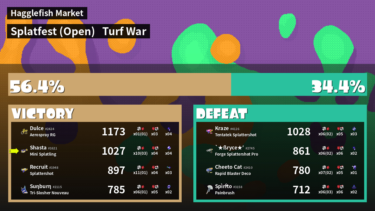 | Medals | #1 Popular Target #1 Enemy-Base Inker #1 Splat Assister | ||