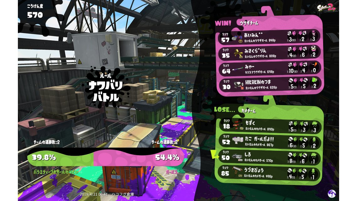| Team ウサギ ガールズ Win Streak: 2 | 2,980 | 19 / 17 | 1.12 52.78% | ||||