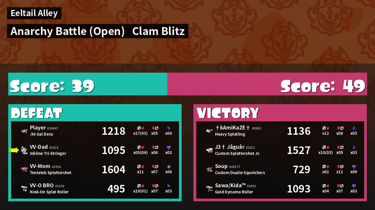 | Medals | #1 Score Booster #1 Clam Carrier #1 Splat Assister | ||