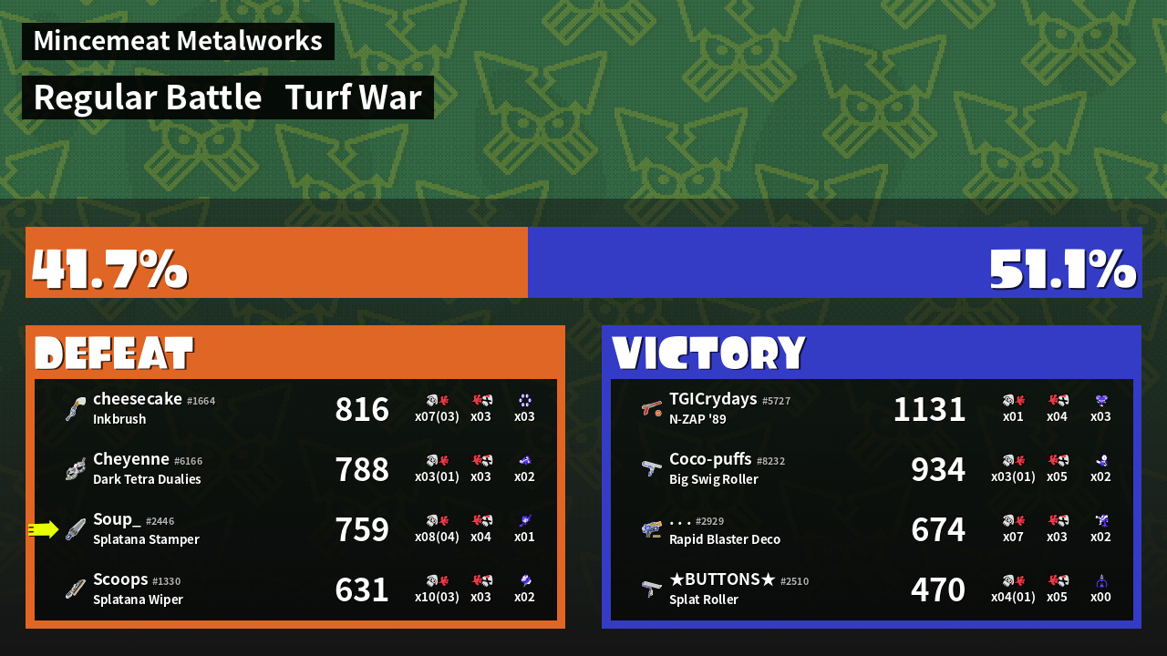 | Medals | #1 Popular Target #1 Enemy-Base Inker #1 Splat Assister | ||