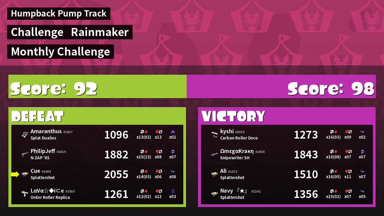 | Medals | #1 Turf Inker #1 Enemy Splatter #1 Damage Taker | ||