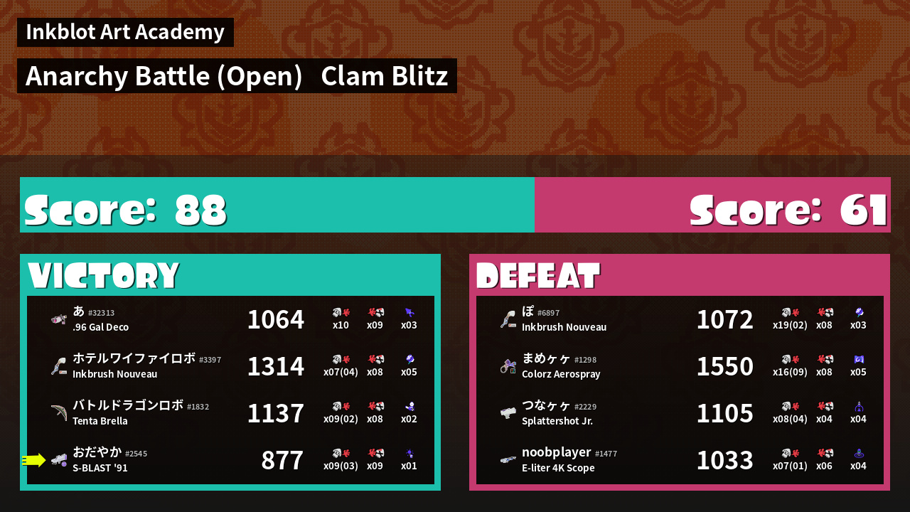 | Mode | Clam Blitz - Anarchy Battle (Open) |