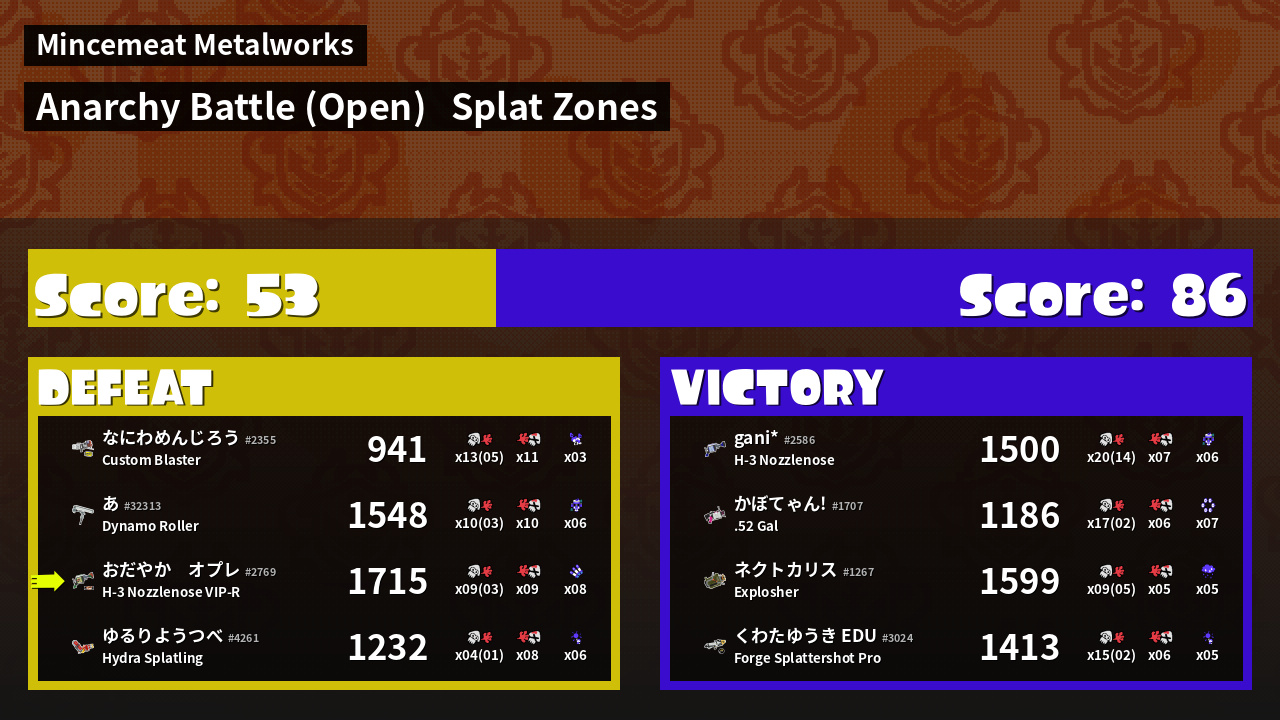 | Mode | Splat Zones - Anarchy Battle (Open) |
