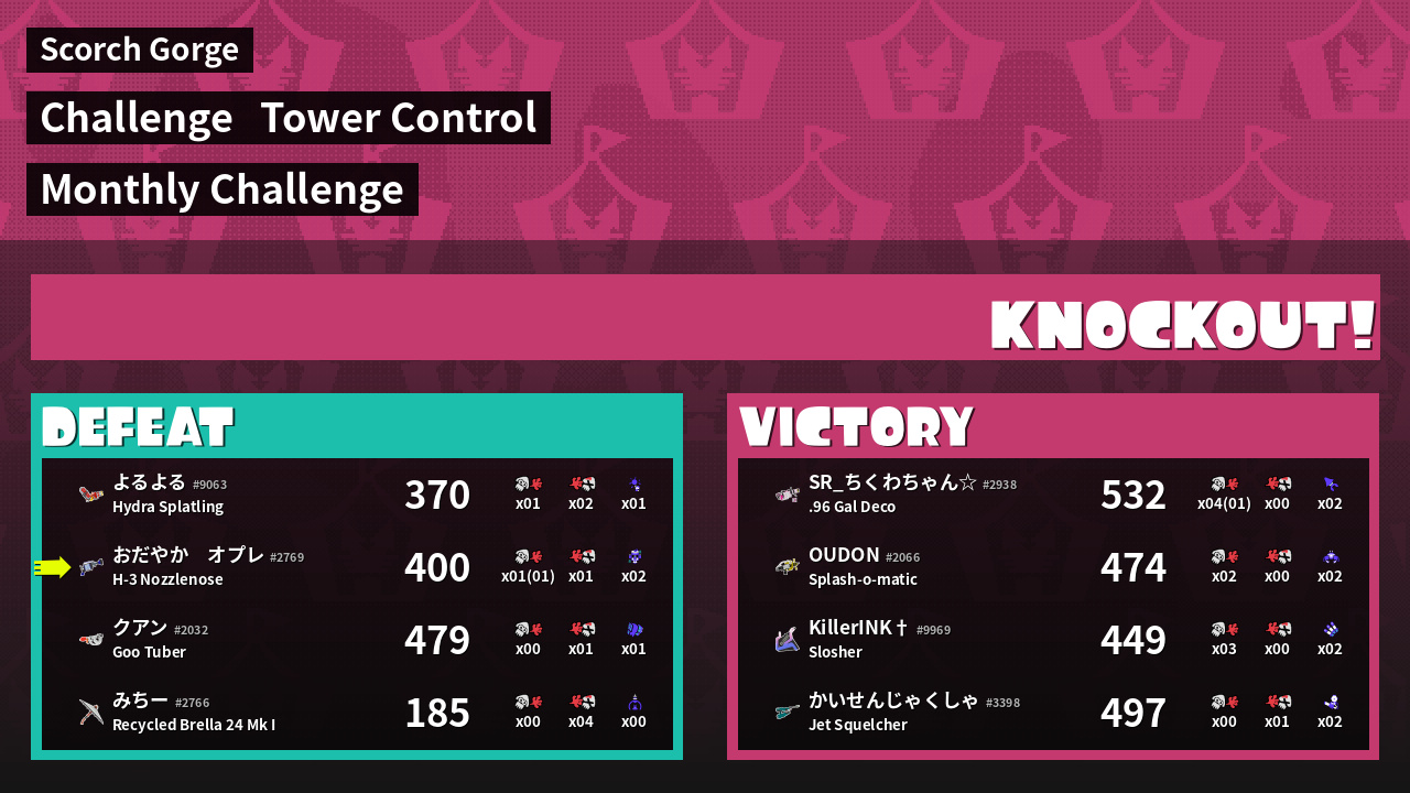 | Medals | #1 Overall Splatter #1 Splat Assister #1 Tower Stopper | ||