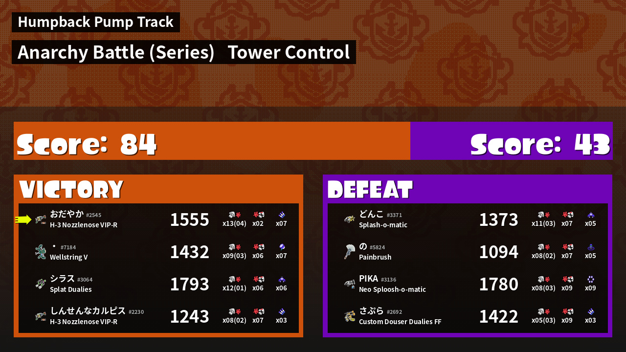 | Weapon | H-3 Nozzlenose VIP-R ( Suction Bomb / Triple Inkstrike) |