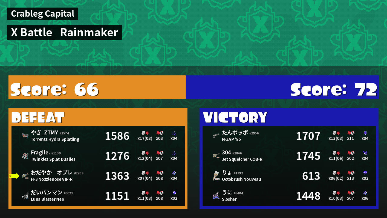 | Weapon | H-3 Nozzlenose VIP-R ( Suction Bomb / Triple Inkstrike) |