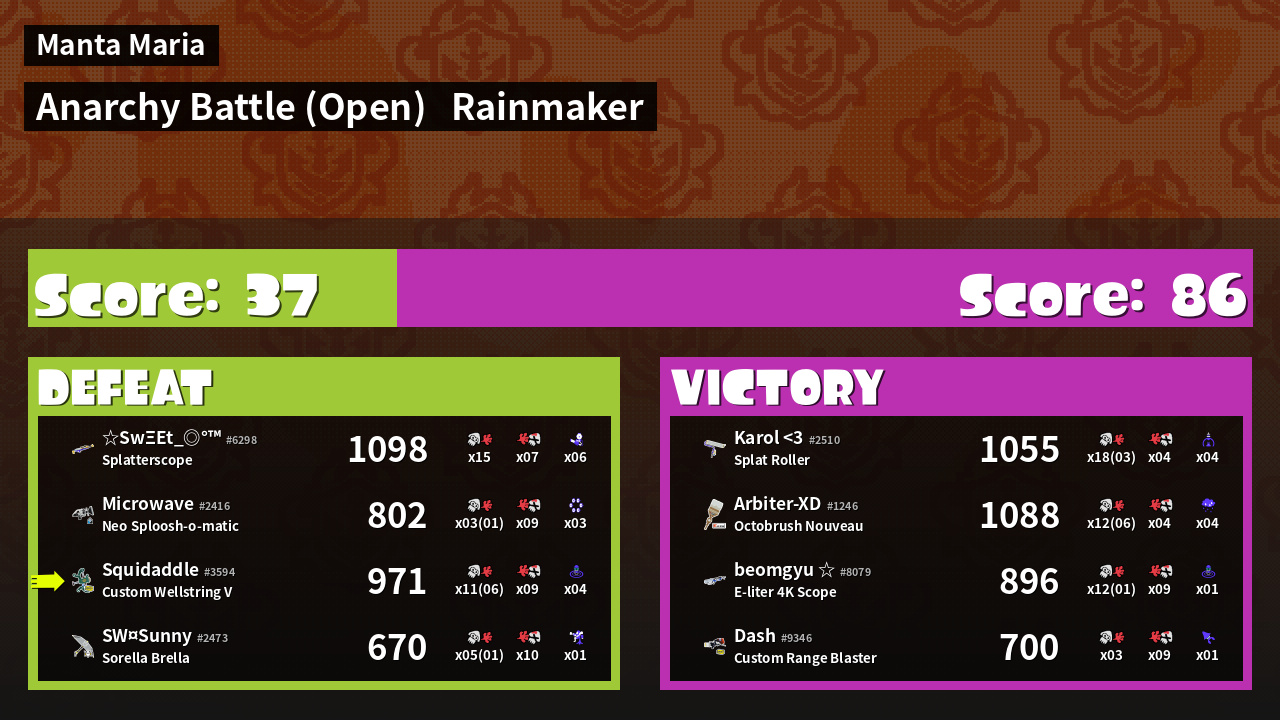 | Medals | #1 Splat Assister #1 Wave Breaker User #2 Overall Splatter | ||