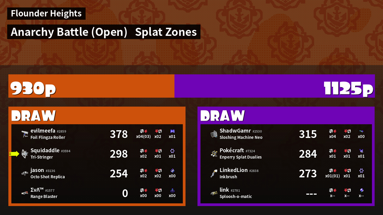 | Mode | Splat Zones - Anarchy Battle (Open) | ||