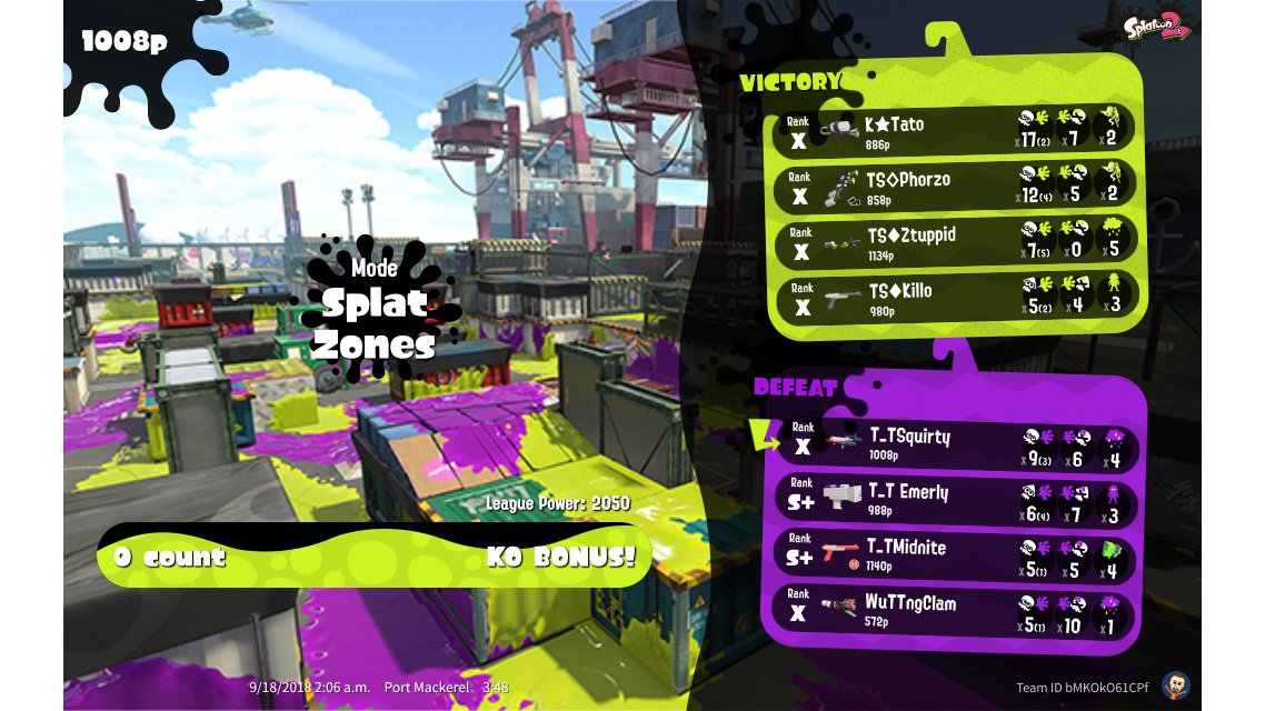 | Mode | Splat Zones - League Battle (Quad) | ||||||||||||||||||||||||||||||||||