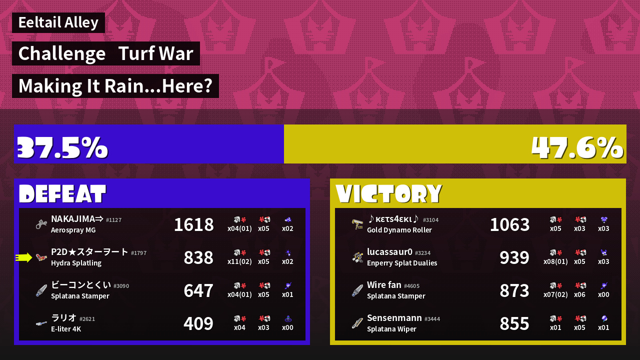 | Medals | #1 Overall Splatter #1 Enemy Splatter #1 Splat Assister | ||
