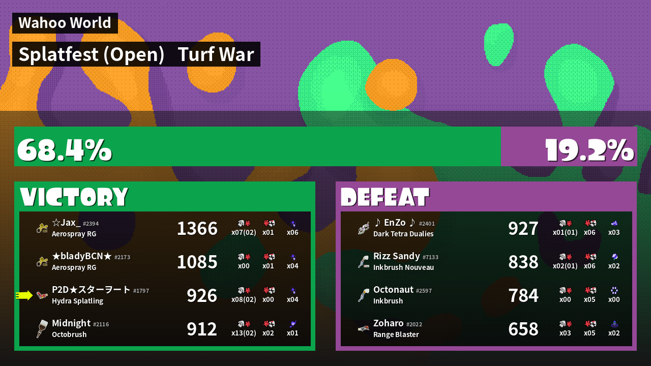 | Medals | #1 Super Jump Spot #1 Splat Assister #2 Overall Splatter | ||