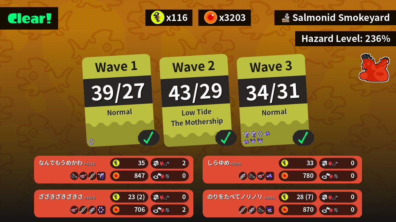 | Weapons | Bloblobber Rapid Blaster Pro Splatana Wiper | Dark Tetra Dualies Bloblobber Rapid Blaster Pro | Splatana Wiper Dark Tetra Dualies Bloblobber | Rapid Blaster Pro Splatana Wiper Dark Tetra Dualies |