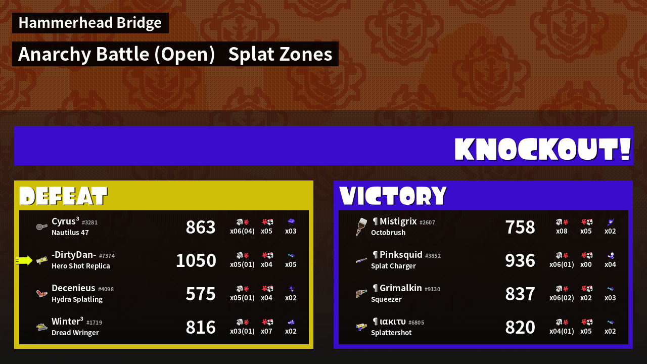 | Medals | #1 Splat Zone Guard #1 Turf Inker #1 Enemy Splatter | ||