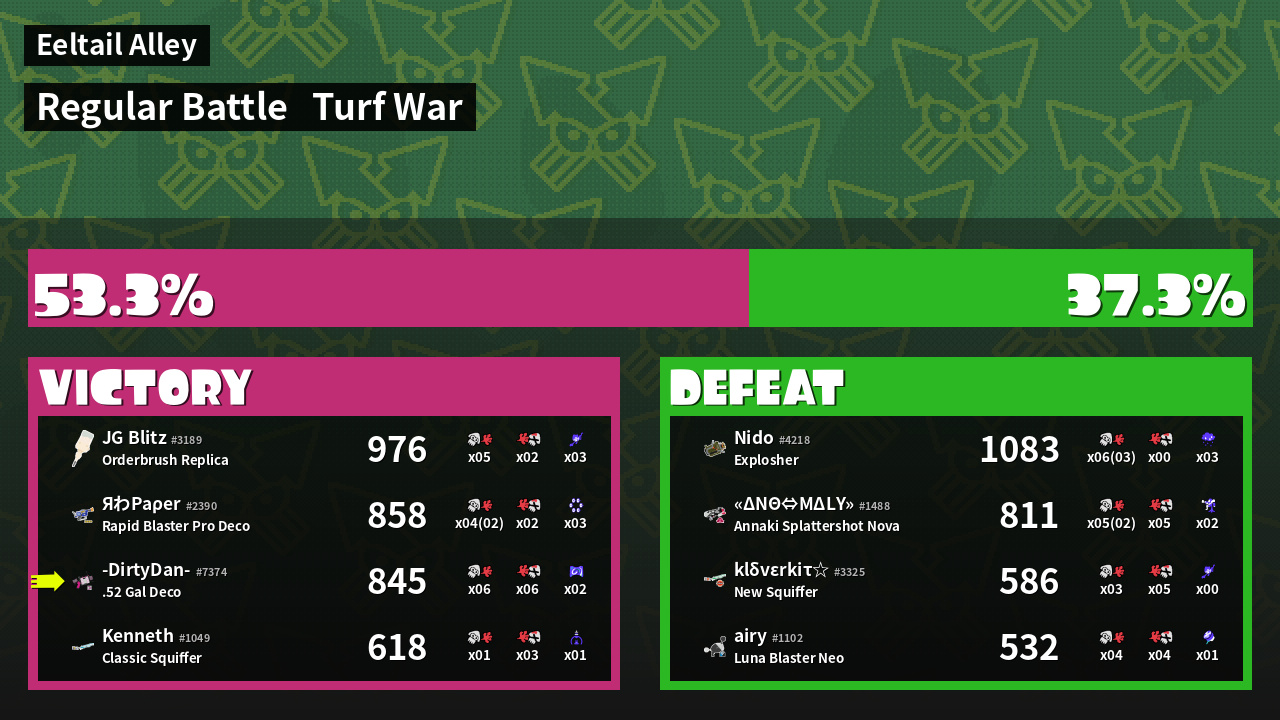 | Medals | #1 Overall Splatter #1 Enemy-Base Inker #1 Enemy Splatter | ||