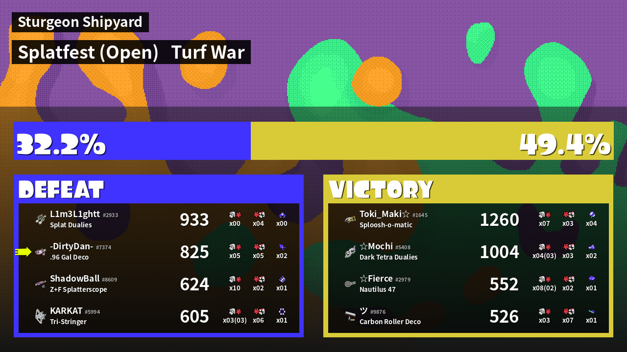 | Medals | #1 Enemy-Base Inker #1 Ground Traveler #2 Overall Splatter | ||