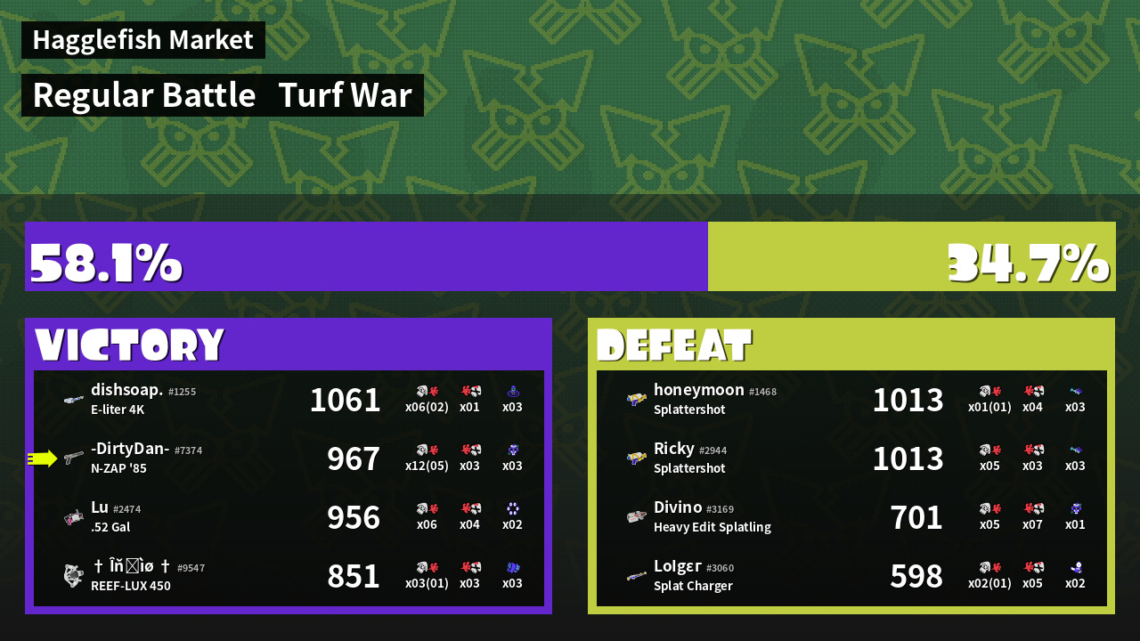 | Medals | #1 Overall Splatter #1 Popular Target #1 Enemy-Base Inker | ||