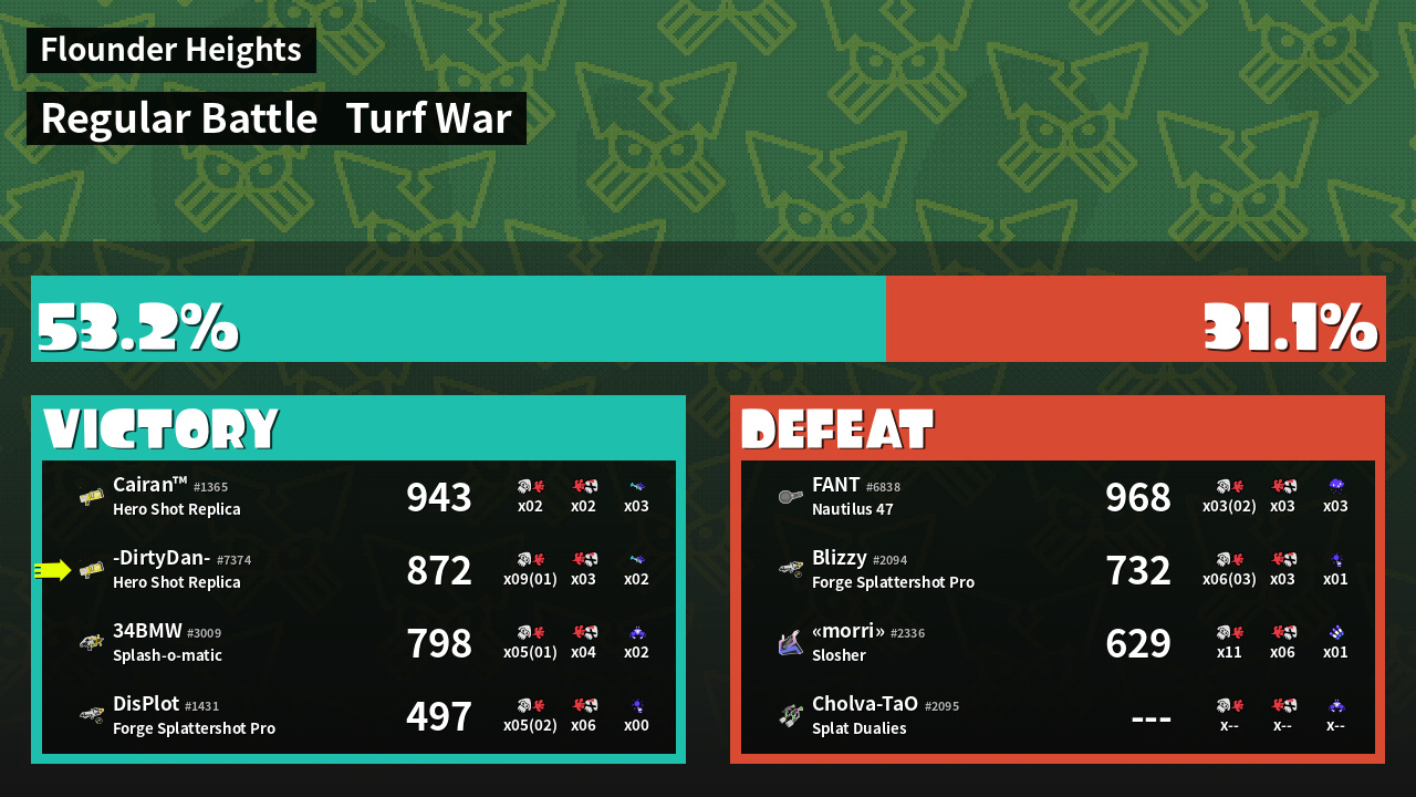 | Medals | #1 Overall Splatter #1 Enemy-Base Inker #1 Enemy Splatter | ||