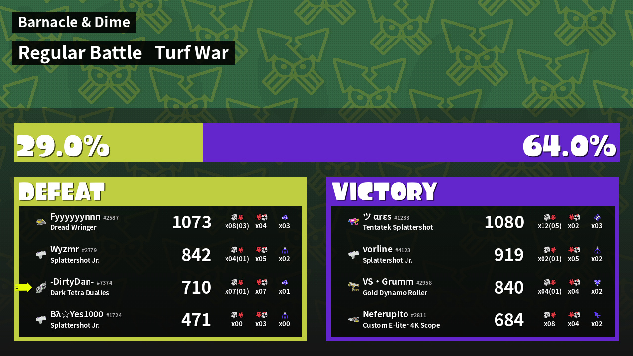| Medals | #1 Popular Target #1 Enemy-Base Inker #1 Enemy Splatter | ||