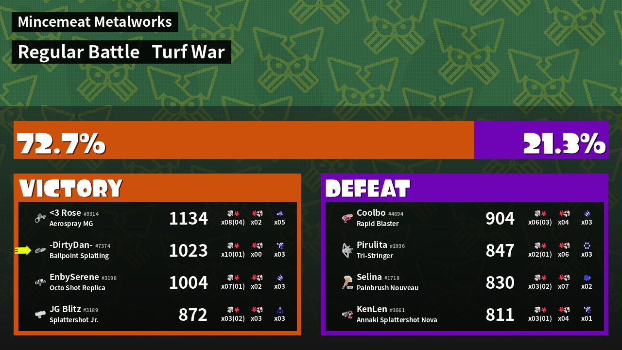| Medals | #1 Overall Splatter #1 Popular Target #1 Enemy-Base Inker | ||