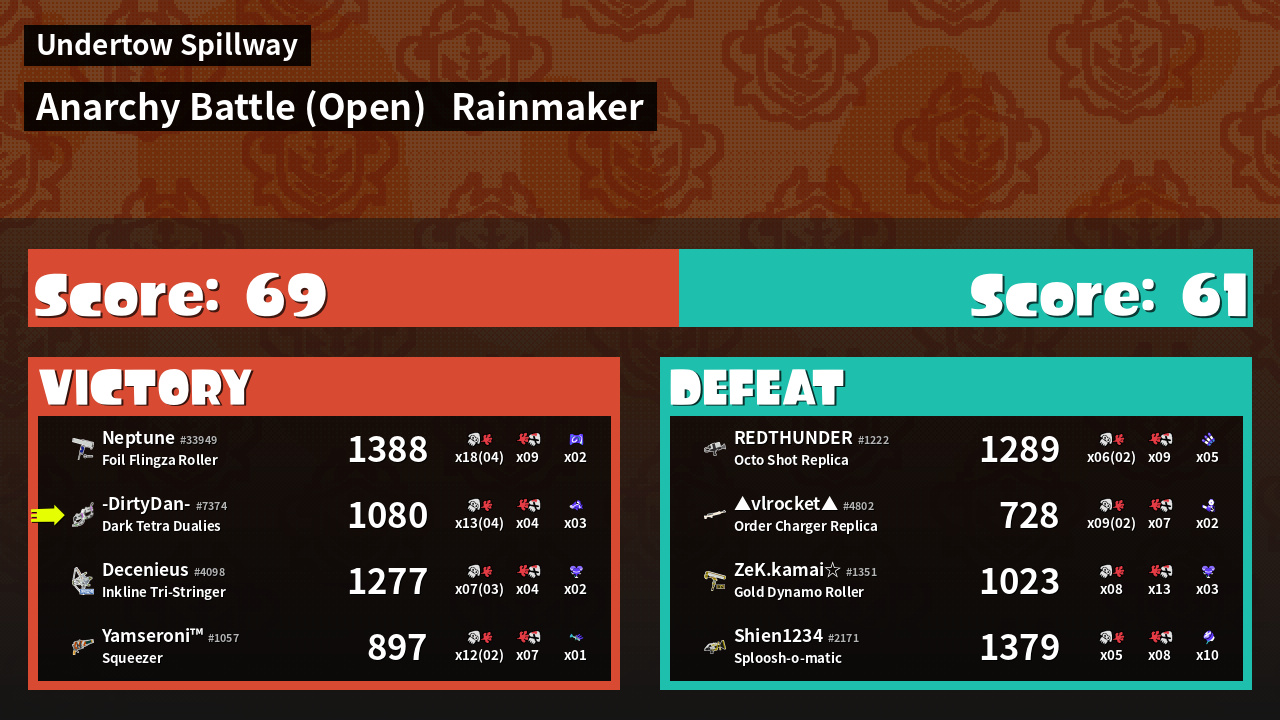 | Medals | #1 Splat Assister #1 Rainmaker Stopper #1 Ink Consumer | ||