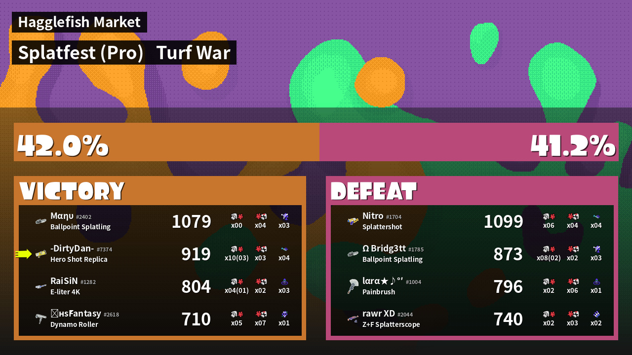 | Medals | #1 Overall Splatter #1 Enemy-Base Inker #1 Enemy Splatter | ||