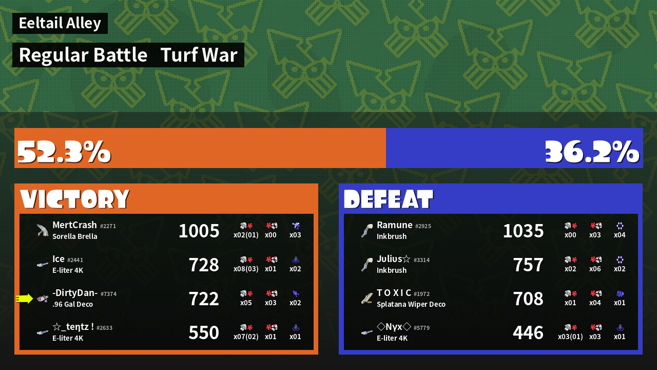 | Medals | #1 Enemy-Base Inker #1 Enemy Splatter #1 Ground Traveler | ||
